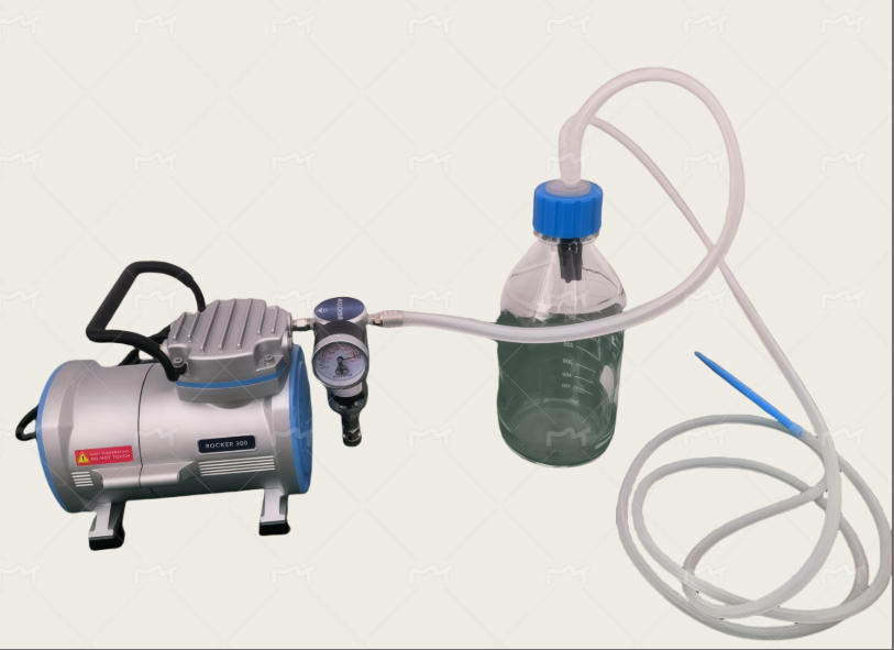R300-1L細胞培養(yǎng)廢液抽吸真空泵由ROCKER300無油真空泵,GL45藍蓋試劑瓶,硅膠管,吸管單獨組成,方面拆卸和清理,廢液瓶可以選配2L,3.5L,5L等更大容積試劑瓶。除真空泵外,其余部件都都可以121℃高溫高壓滅菌,