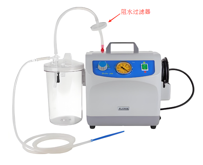為防止液體倒吸進入真空泵,建議在廢液瓶和真空泵之間鏈接阻水過濾器,以防止抽吸過程中液體隨著氣流進入真空泵,長時間的累積,導致真空泵內(nèi)部軸承生銹卡住。連接方法如圖4所示。另外注意Biovac240主機背后有散熱風扇,在使用過程中應禁止液體灑入,導致機器短路故障。建議將真空泵放置在安全柜或?qū)嶒炁_下方,遠離一切可能接觸到液體的環(huán)境。如不慎將液體灑入風扇,應立即關機,然后聯(lián)系客服人員。